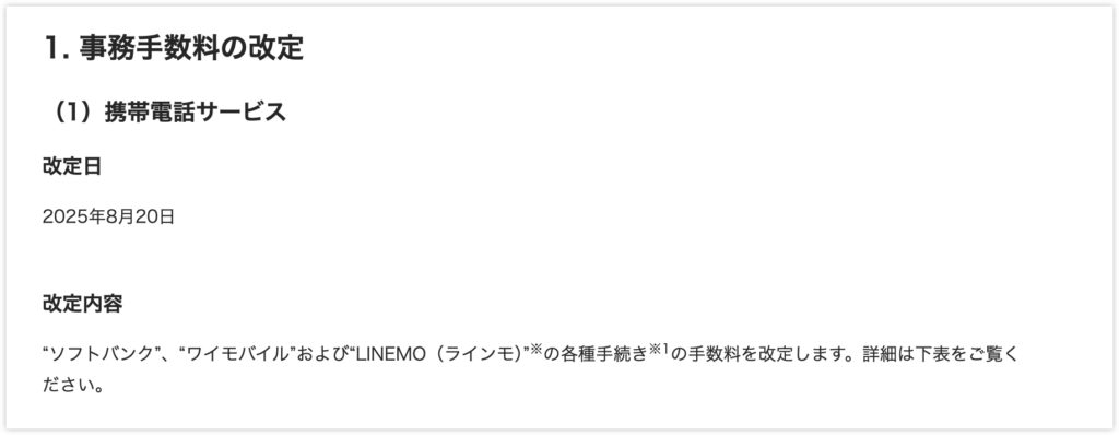 ソフトバンク・ワイモバイル・LINEMOの各種手続きにかかる事務手数料が2025年8月20日から改定されます。