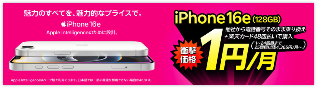 楽天モバイルがiPhone 16eを月1円で使えるキャンペーンです。