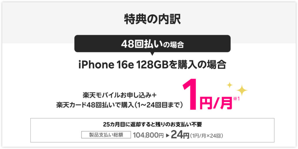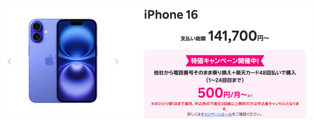 楽天モバイルがiPhone 16eを月1円で使えるキャンペーンを開始しました。