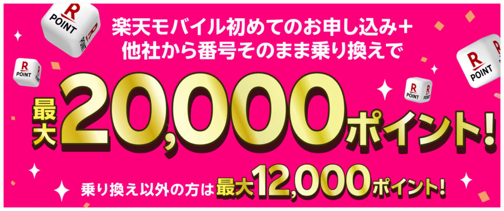 楽天モバイル初めての申し込み&楽天市場のご利用(既存でも可能)で最大20,000pt還元