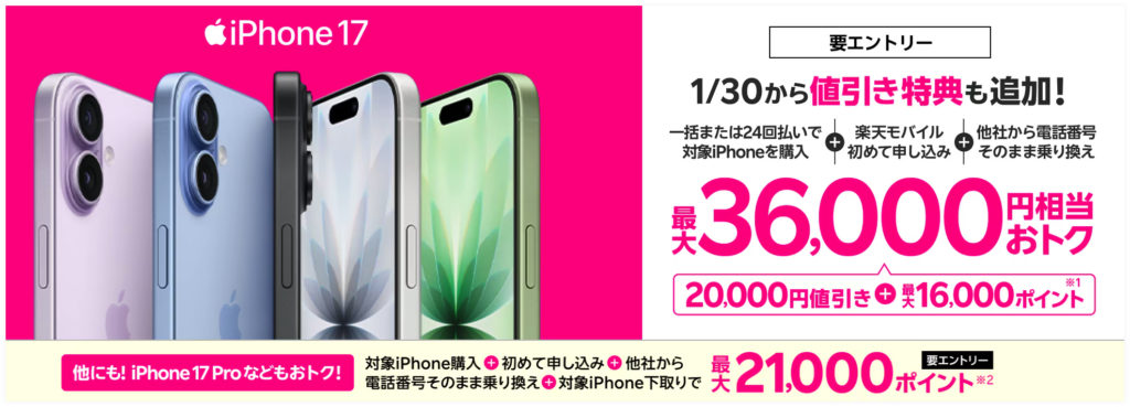 最新のiPhone 17購入で最大36,000円相当還元キャンペーン