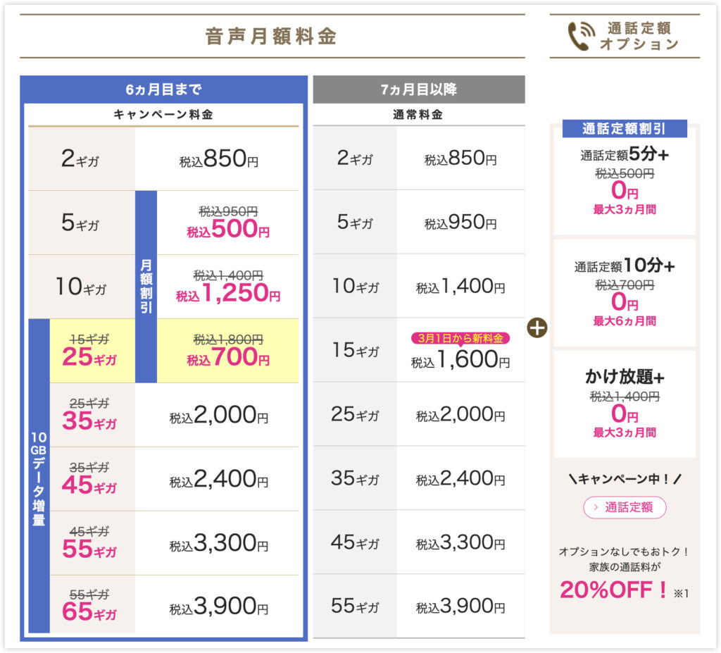 15〜55GBの音声プランは毎月10GB増量。最大6カ月間。